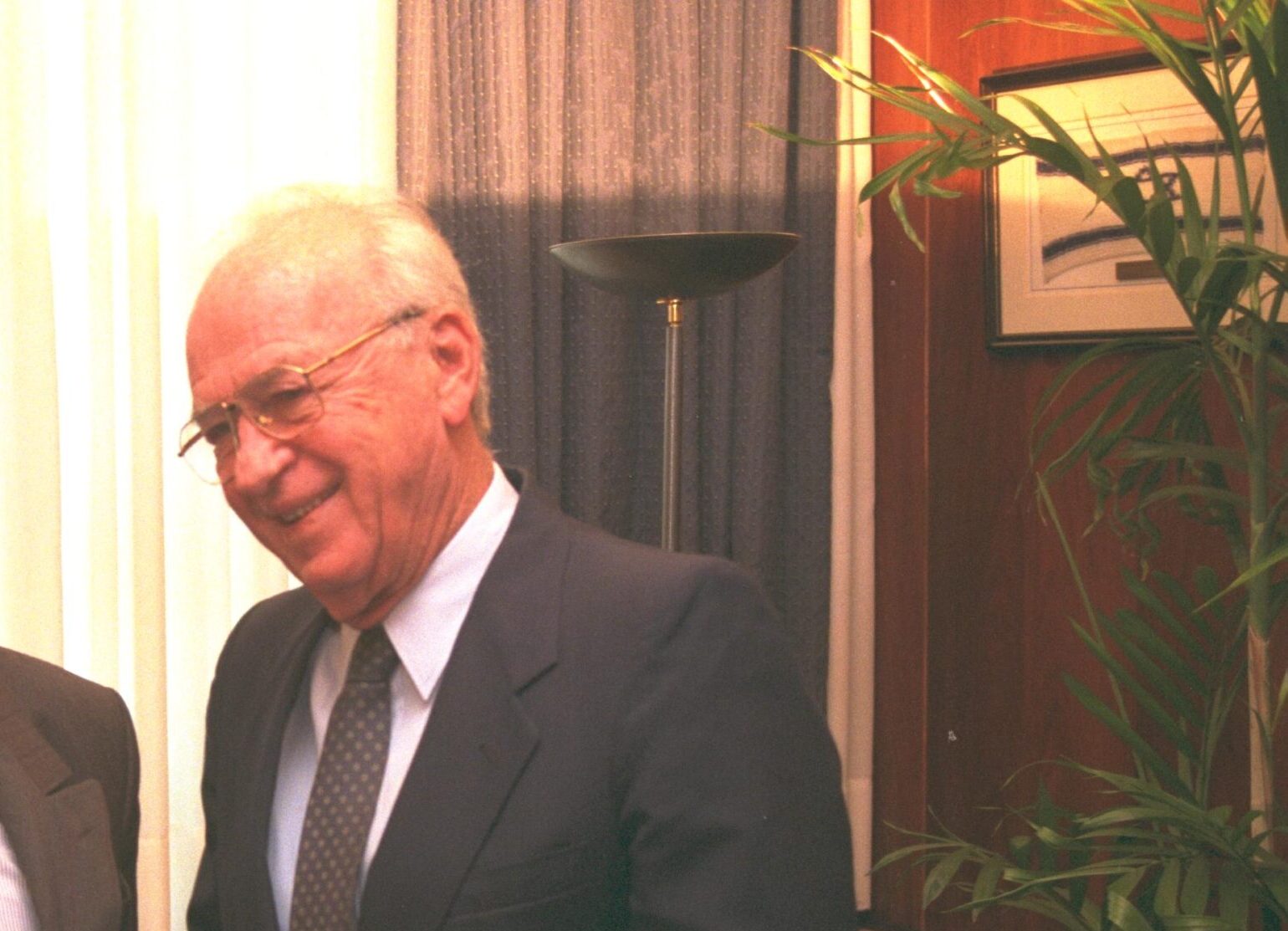 P.M. YITZHAK RABIN SHAKING HANDS WITH SOUTH AFRICAN FOREIGN MINISTER ALFRED NZO PRIOR TO THEIR MEETING IN JERUSALEM.
