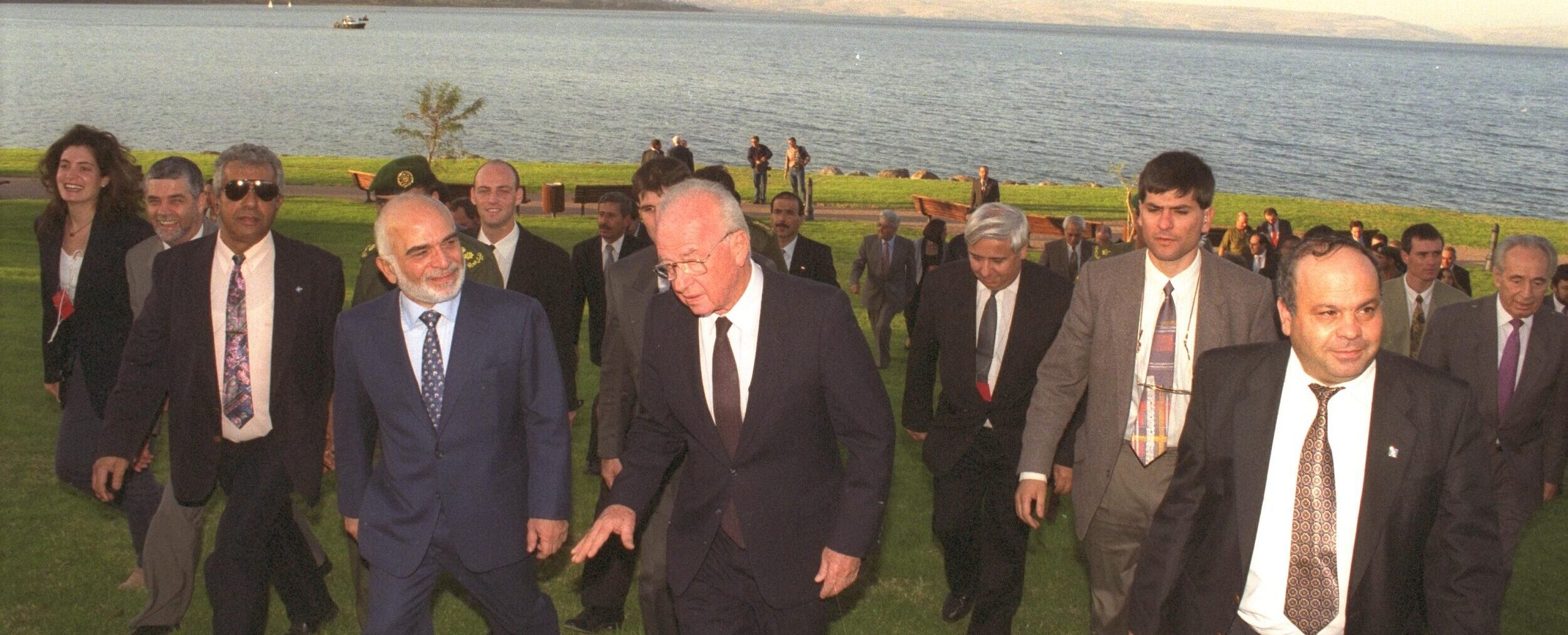 PM YITZHAK RABIN (WITH GLASSES) AND KING HUSSEIN OF JORDAN (L) CONFER ON THE SHORES OF THE SEA OF GALILEE AFTER THE RATIFICATION OF THE ISRAELI JORDANIAN PEACE TREATY